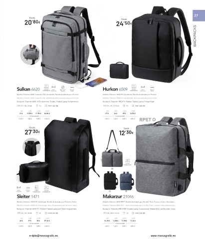 Backpack. Polyester 600D. USB Connection. Padded. Padded Laptop Compartment. Backpack. Polyester 300D/ PU. Padded. Padded Laptop Compartment.
