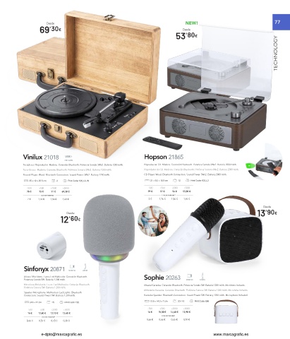 Record Player. Wood. Bluetooth Connection. Sound Power 3Wx2. Battery 1200 mAh. CD Player. Wood. Bluetooth Connection. Sound Power 3Wx2. Battery 2000 mAh.